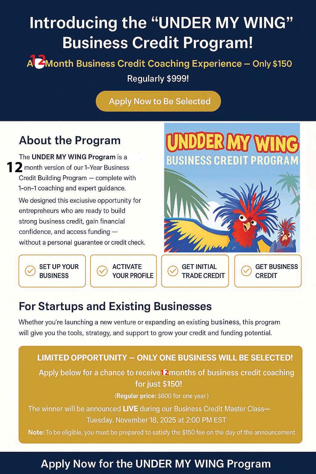 ONLY ONE (1) BUSINESS WILL BE SELECTED FOR THE UNDER MY WING PROGRAM